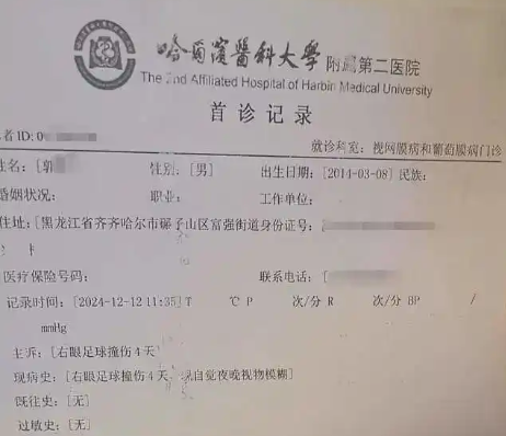 近日,黑龙江齐齐哈尔市的宋女士向极目新闻反映,她的孩子郭同学就读于齐齐哈尔市碾子山区第一小学。2024年12月,郭同学在课间时间和同班同学踢足球时,不慎被足球伤到了右眼